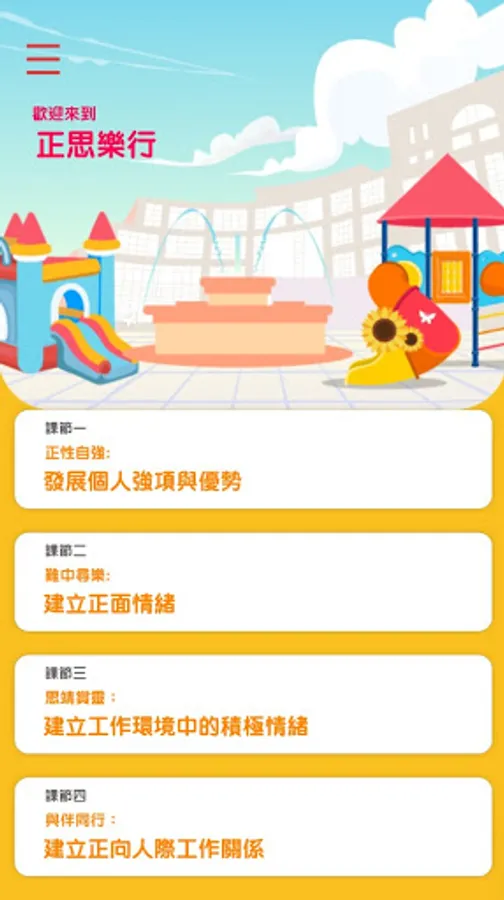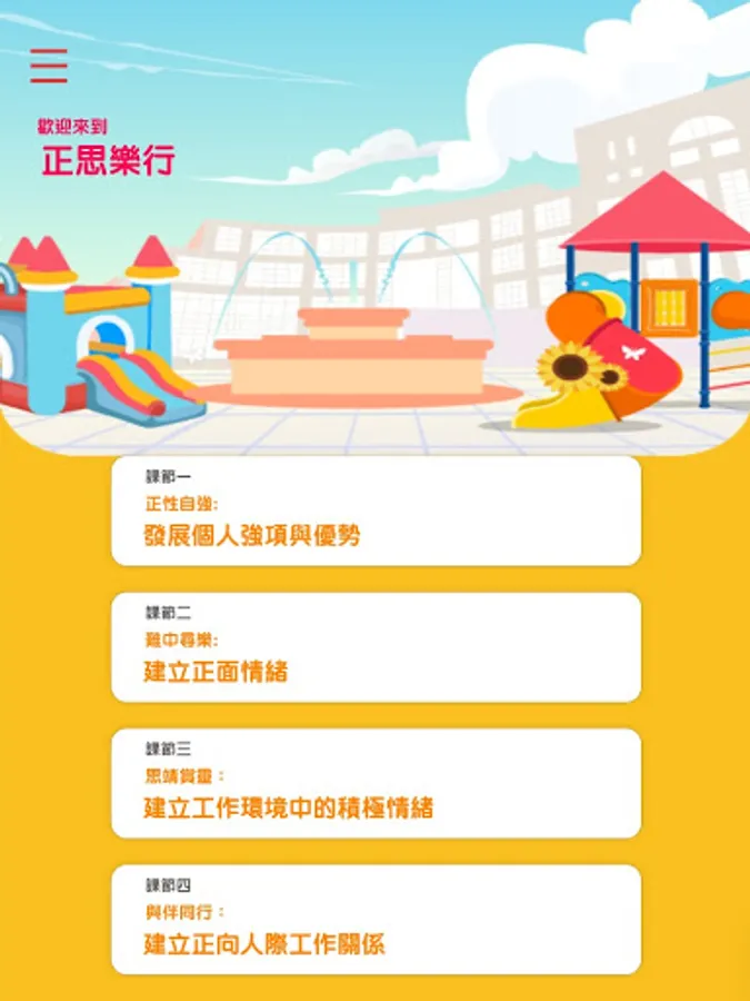 此手機應用程式是由香港教育大學教育及人類發展學院基金資助,兒童與家庭科學中心開發。這程式是一個學習平台,旨在幫助老師及家長提升其幸福感及改善他們的社交情緒健康。其內容建基於「正向教育」的理論 ,包含培訓資訊、實踐及應用練習、遊戲、情境劇場,以及其他教育活動和資源。