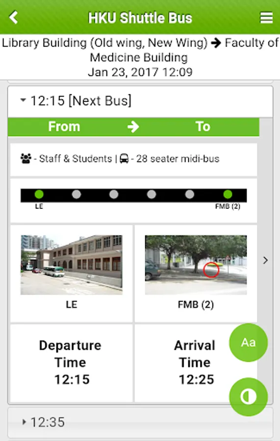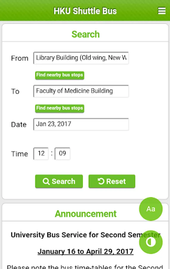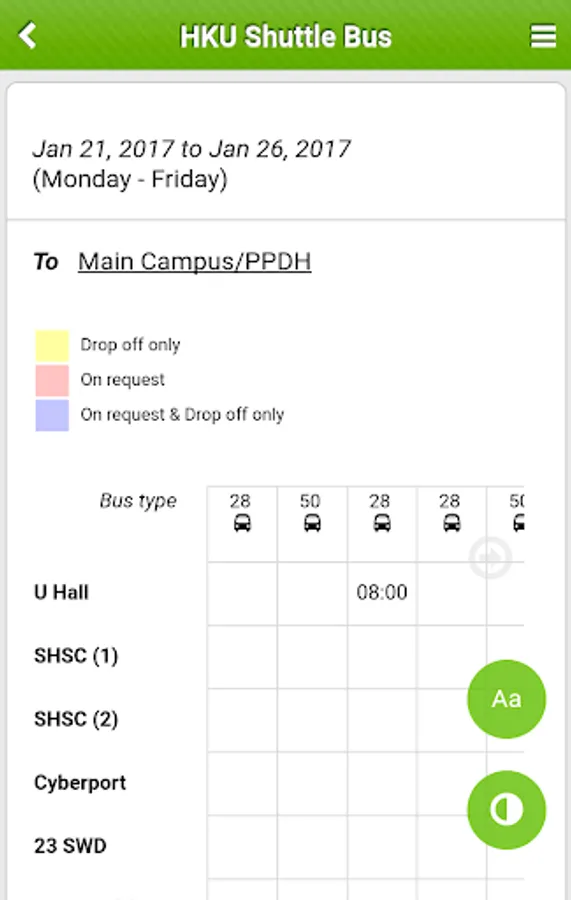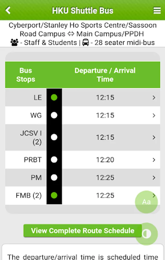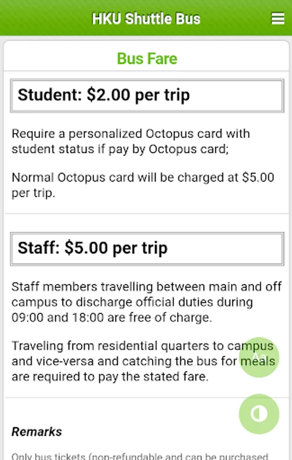 The HKU Shuttle Bus app brings you all useful information related to the shuttle bus service. Information of the routes, estimated journey time, bus stop location will be displayed accordingly. Traffic news will be released when the service has been or is expected to be seriously delayed or suspended. Operation time of bus service right before/after typhoon will be available.