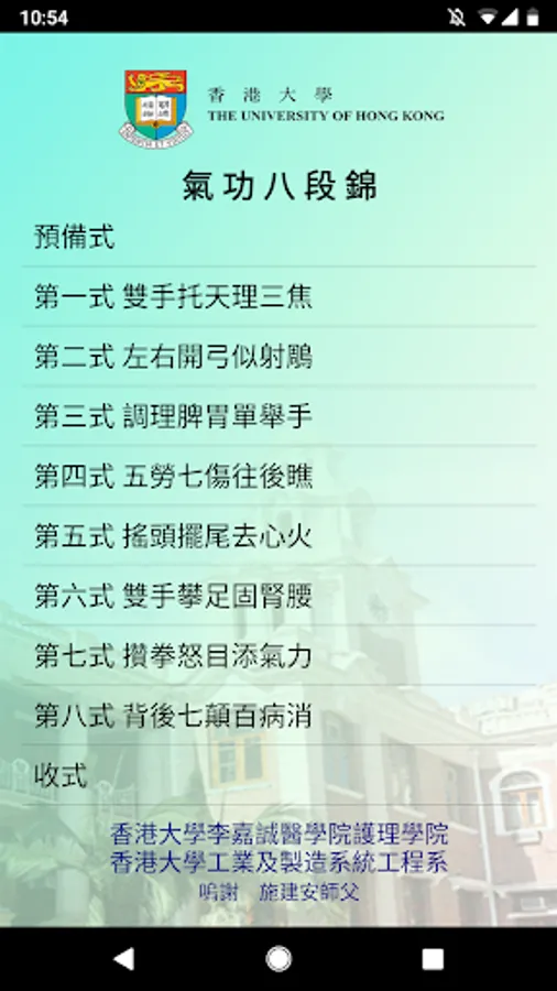 氣功八段錦是中國傳統的保健養生運動,強調固本培元,利用呼吸、肢體運動和意識來調整身體機能,強健體魄,適合任何年齡人士進行。八段錦總共有八個招式,動作簡單易學,重複練習對於身心健康有莫大裨益,其益處包括拉伸經筋、通經活絡、調和氣血等,更有效提高免疫力,促進新陳代謝。有見及此,我們特意透過電子平台讓更多人認識氣功八段錦。