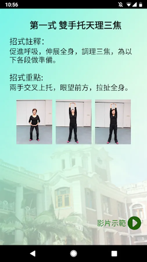 二、 招式註釋及重點:顯示各種八段錦招式的描述,以及招式精要,並附有相片參考