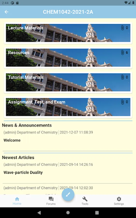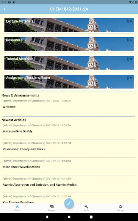 In this app, you may find lecture notes and videos, assignments, extra exercises, and tutorial articles for some CHEM courses. In addition, you may start discussion threads and join the discussions in the class forums! Tutors and teachers may participate in the discussion as well. You can choose your own display name in the app.
