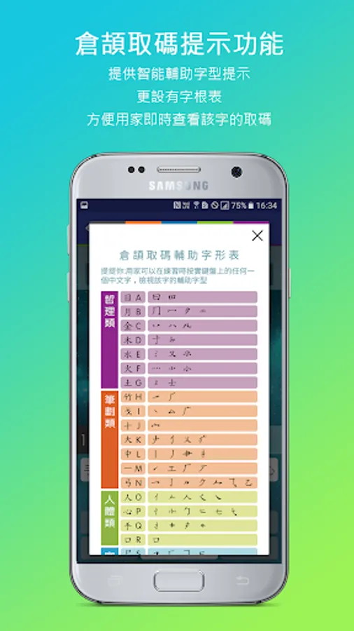 + 將字根表結合在鍵盤上,只要按著鍵盤上的按鍵或按提示功能,即能顯示相關的字根。