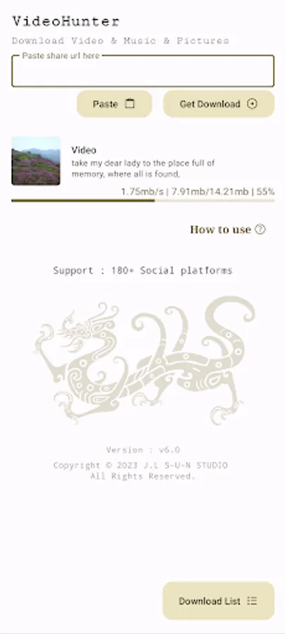 Copy the sharing link of the social network to download the video, music and photo gallery to your mobile phone, which can be viewed offline, and supports 80+ social networking platforms in the world. Very easy and 100% free with unlimited uses.