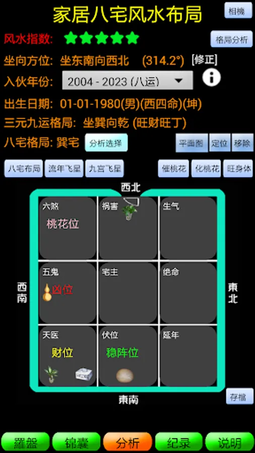本软件是基于「三元九运」、「八宅法」和「九宫飞星」这三套相当有系统的理气风水原理而设计。根据电子罗盘或输入的大门方向,程序先使用「三元九运」确定这居室的整体吉凶性质如「旺财旺丁」、「损财伤丁」等等而提供风水指数。同时程序亦以「八宅法」找出居室内之吉凶位置如「财位」、「凶位」等等,从而提供建议让用户决定室内房间及家具之最佳位置。最后本程序还使用每年的「流年飞星图」找出当年之病位、桃花位、财位及文昌位,作催财、化病、催桃花或人缘、和旺考试及读书之用,而「九宫飞星」功能是根据「玄空紫白诀」理论进一步详细地分析家居与及办公室的风水布局。