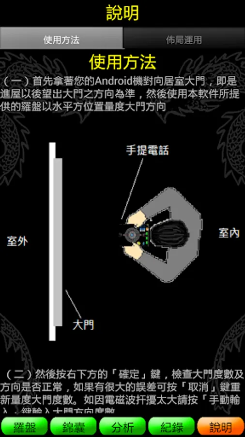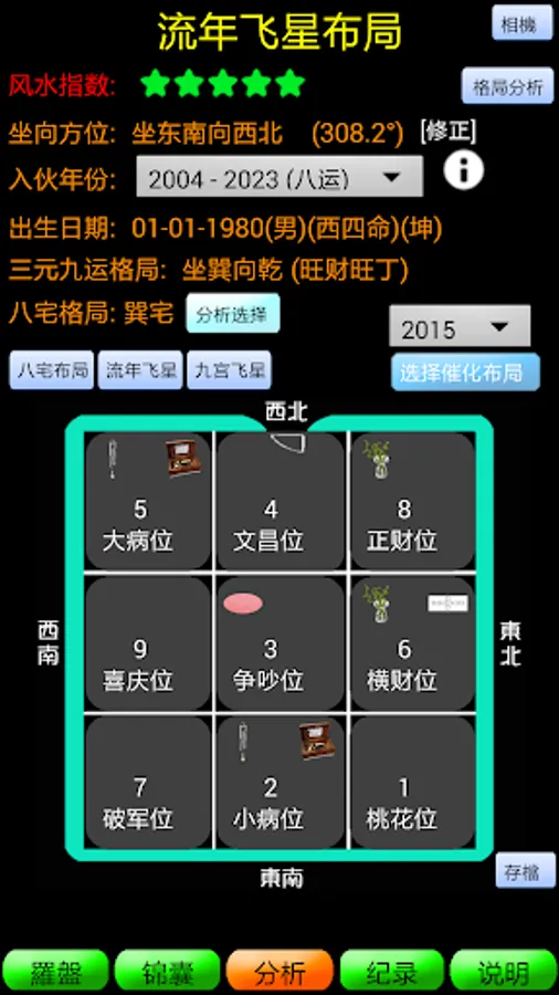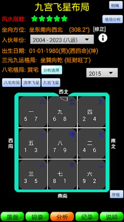 本软件是基于「三元九运」、「八宅法」和「九宫飞星」这三套相当有系统的理气风水原理而设计。根据电子罗盘或输入的大门方向,程序先使用「三元九运」确定这居室的整体吉凶性质如「旺财旺丁」、「损财伤丁」等等而提供风水指数。同时程序亦以「八宅法」找出居室内之吉凶位置如「财位」、「凶位」等等,从而提供建议让用户决定室内房间及家具之最佳位置。最后本程序还使用每年的「流年飞星图」找出当年之病位、桃花位、财位及文昌位,作催财、化病、催桃花或人缘、和旺考试及读书之用,而「九宫飞星」功能是根据「玄空紫白诀」理论进一步详细地分析家居与及办公室的风水布局。