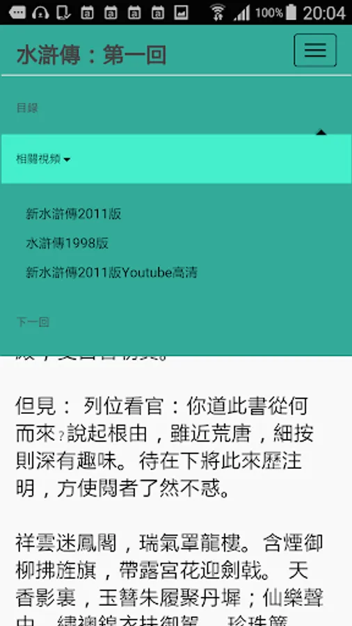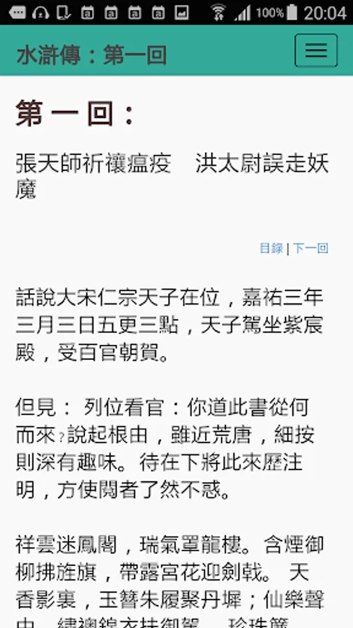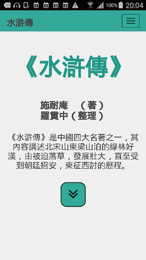《水滸傳》是中國四大名著之一, 其內容講述北宋山東梁山泊的綠林好漢,由被迫落草,發展壯大,直至受到朝廷招安,東征西討的歷程。