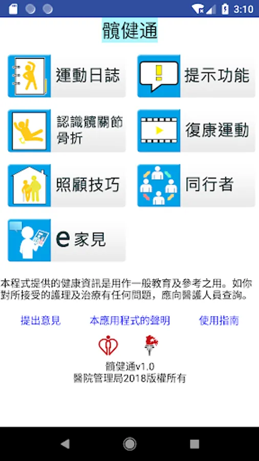 "Hip Health" provides information on hip fracture care, including "Understanding Hip Fracture", "Caring Skills", "Rehabilitation Campaign" and "People". In addition, the physiotherapist can set the training prompts in the program. The program will issue a notification according to the settings. After the patient announces the rehabilitation exercise according to the instructions and stores the records in the program's exercise log, the physiotherapist can clearly know the patient training situation.