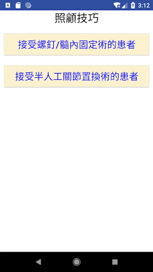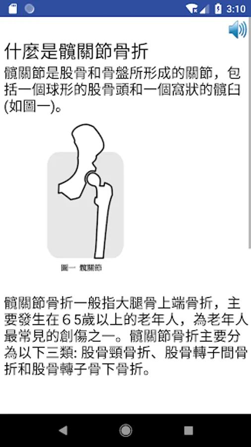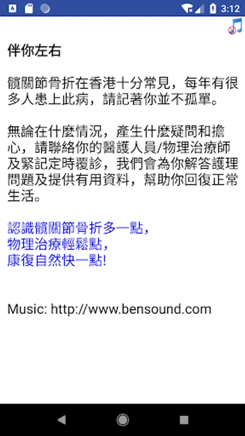 This app provides information about hip fracture care including "Understanding Hip Fracture", " Hip Fracture Care", "Training" and "Companion". In addition, physiotherapists can set notification for training program and the app will send alerts to prompt users to start The training in accordance with the setting. Patients can then complete the training and save the record in the app. Physiotherapists can monitor patient training status in the app.