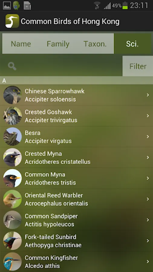 * Can sort bird list by their common names, family names, scientific names and taxonomic order