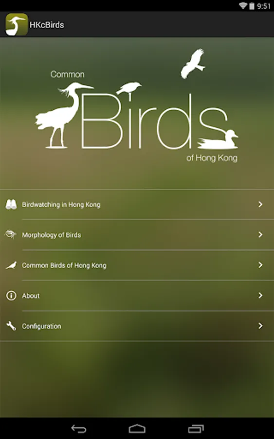 The App "HKcBirds: Common Birds of Hong Kong" is jointly developed by Department of Computer Science, The University of Hong Kong and The Hong Kong Bird Watching Society, under the project titled "Birds of Hong Kong in Your Hands" supported by the HKU Knowledge Exchange Fund.