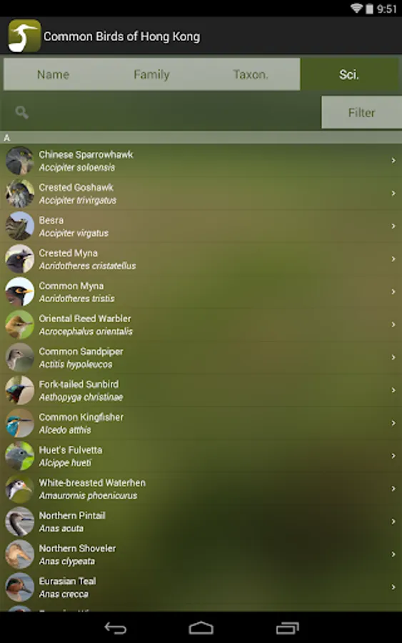 * Can filter bird list by family, IUCN status, principal status, habitat and size