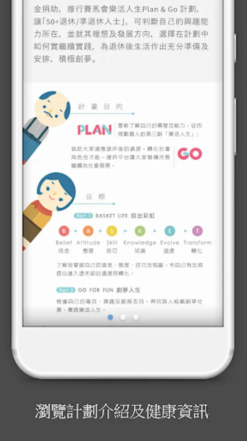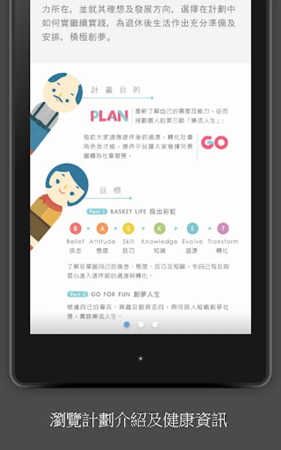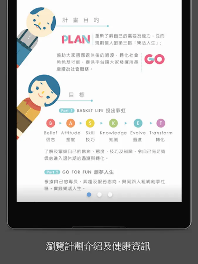 為退休人士提供實在的健康資訊,如政府,醫療,飲食及運動等資訊。