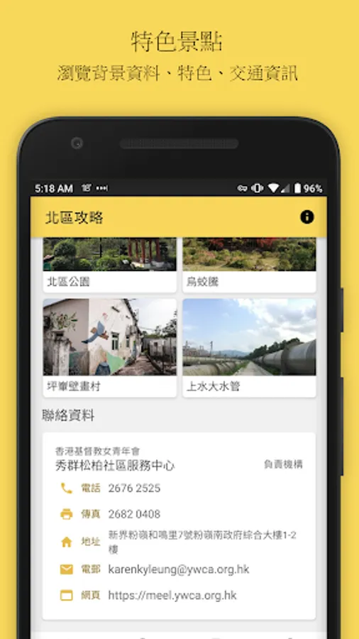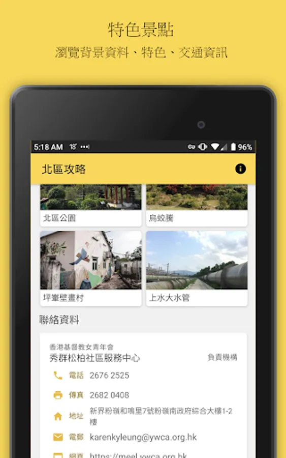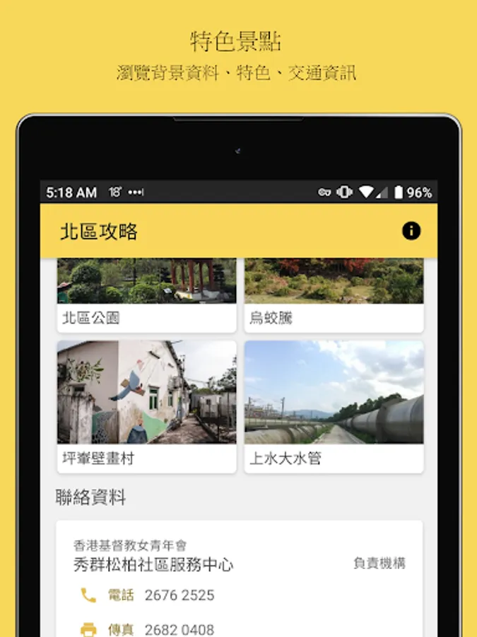 香港基督教女青年會秀群松柏社區服務中心的「北區攻略」應用程式現已隆重登場。這是一個免費景點流動資訊及導覽平台。利用地圖、語音、文字及圖片,用家可以查看指定導賞路線及多個景點,深入了解北區的歷史及文化,更有導賞員聲音導航介紹周邊小故事及趣聞。