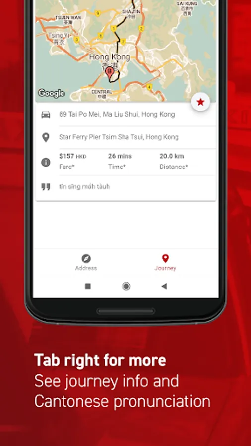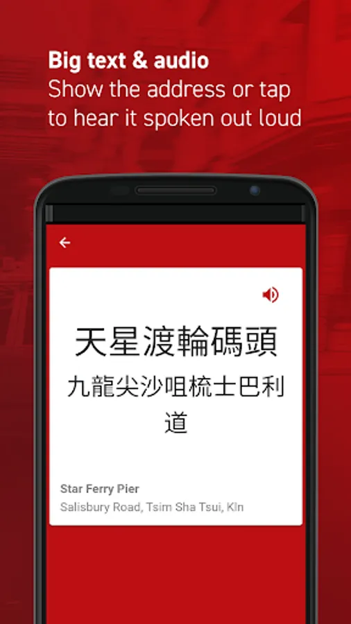 Living in Hong Kong? Just visiting? Try HK’s favorite address translator to search addresses in English and translate them into Cantonese in easy-to-read text. Show the address to your taxi driver and be on your way. Plus, see the estimated price, time, and Cantonese pronunciation for your trip!