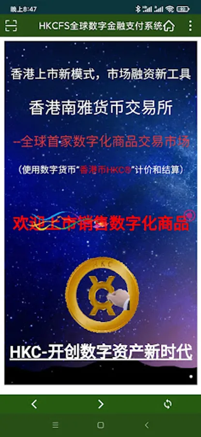 The Global Digital Financial Payment System (HKCFS) is built on the basis of blockchain technology, denominated and settled in the stable encrypted digital currency "Hong Kong currency HKC®", and realized asset transaction, storage, value preservation, appreciation, transfer and payment through computer technology. A decentralized and collectively maintained distributed digital asset payment and settlement system with openness, independence, security and anonymity that is jointly verified and managed by multi-party franchise chain nodes;