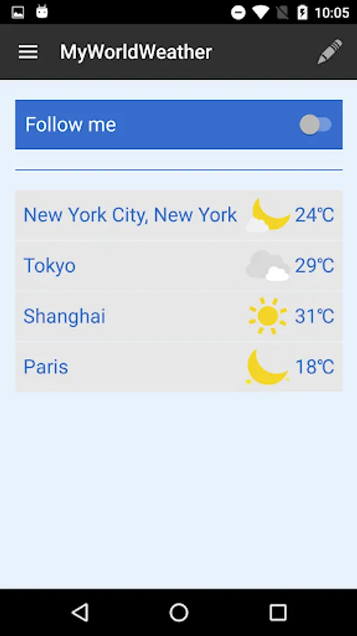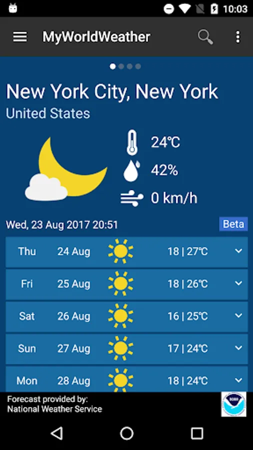 'MyWorldWeather' is a mobile version of the WWIS developed for Android platform. It is equipped with location-based technology to detect the location where the user is located and to provide users with official city weather forecast automatically.