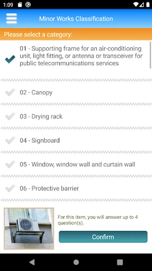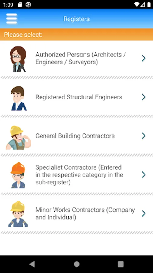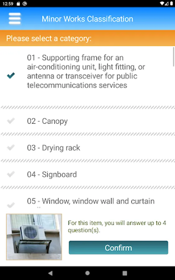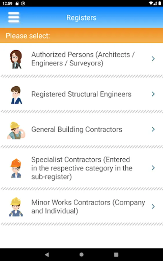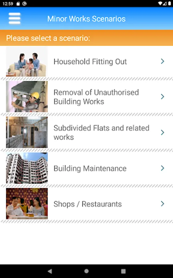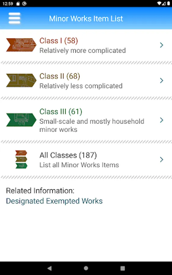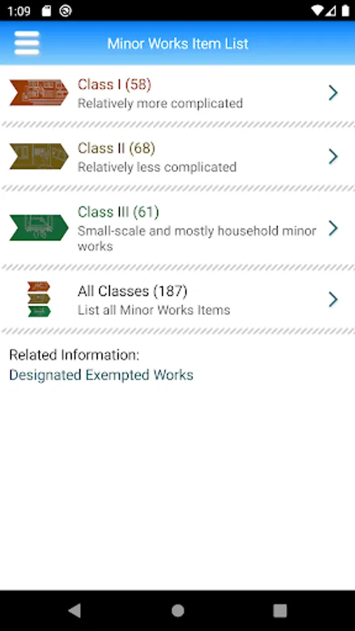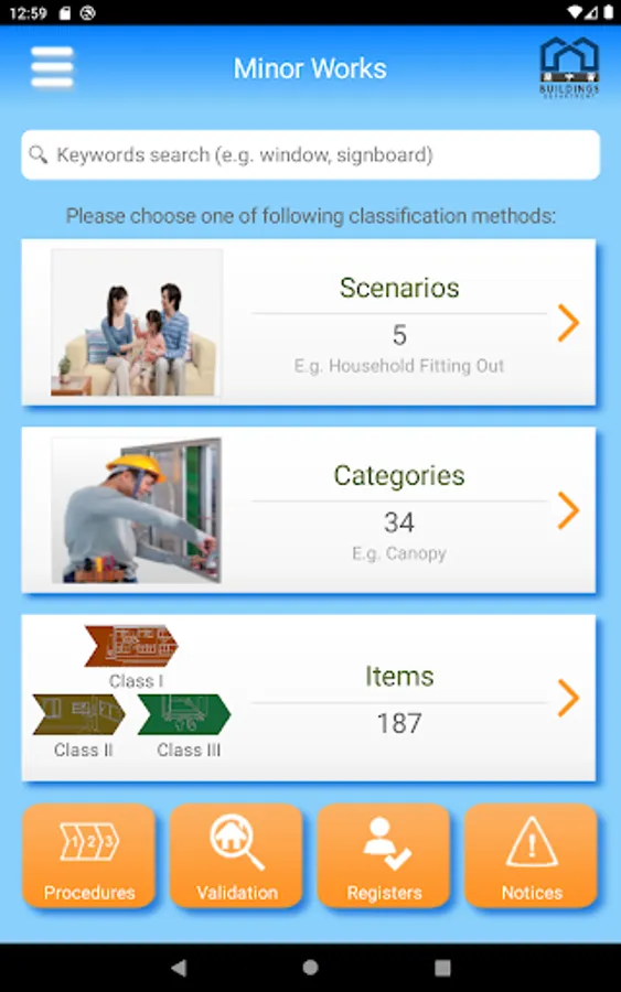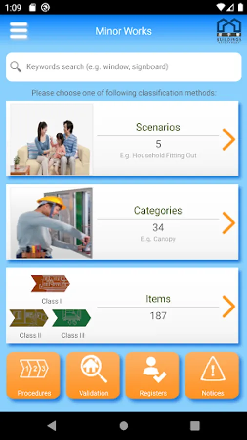 This App provides 3 quick search methods to enable users to identify the correct class/type/item number/description of the proposed minor works. Based on this information, users may then choose suitable building professional / registered building contractor to carry out the works.