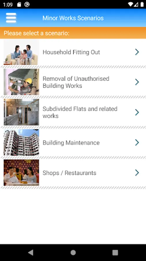 Users may also learn more about the required procedures for carrying out minor works, the Household Minor Works Validation Scheme / Validation Scheme for Unauthorised Signboards, using this App.