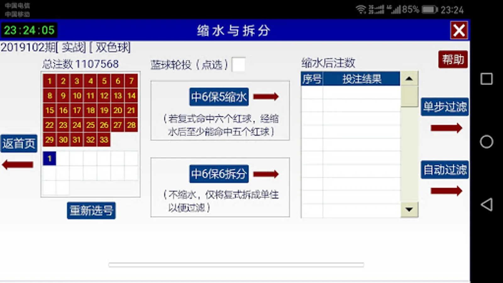 《双色球霸主》的“中6保5缩水”和“过滤”,是在霍华德的“聪明组合”和“平衡选号”基础上发展而成。以2010034期为例,全包红蓝球共17721088注,通过“霸主”缩水过滤到到48注,结果中一等奖和15个二等奖。