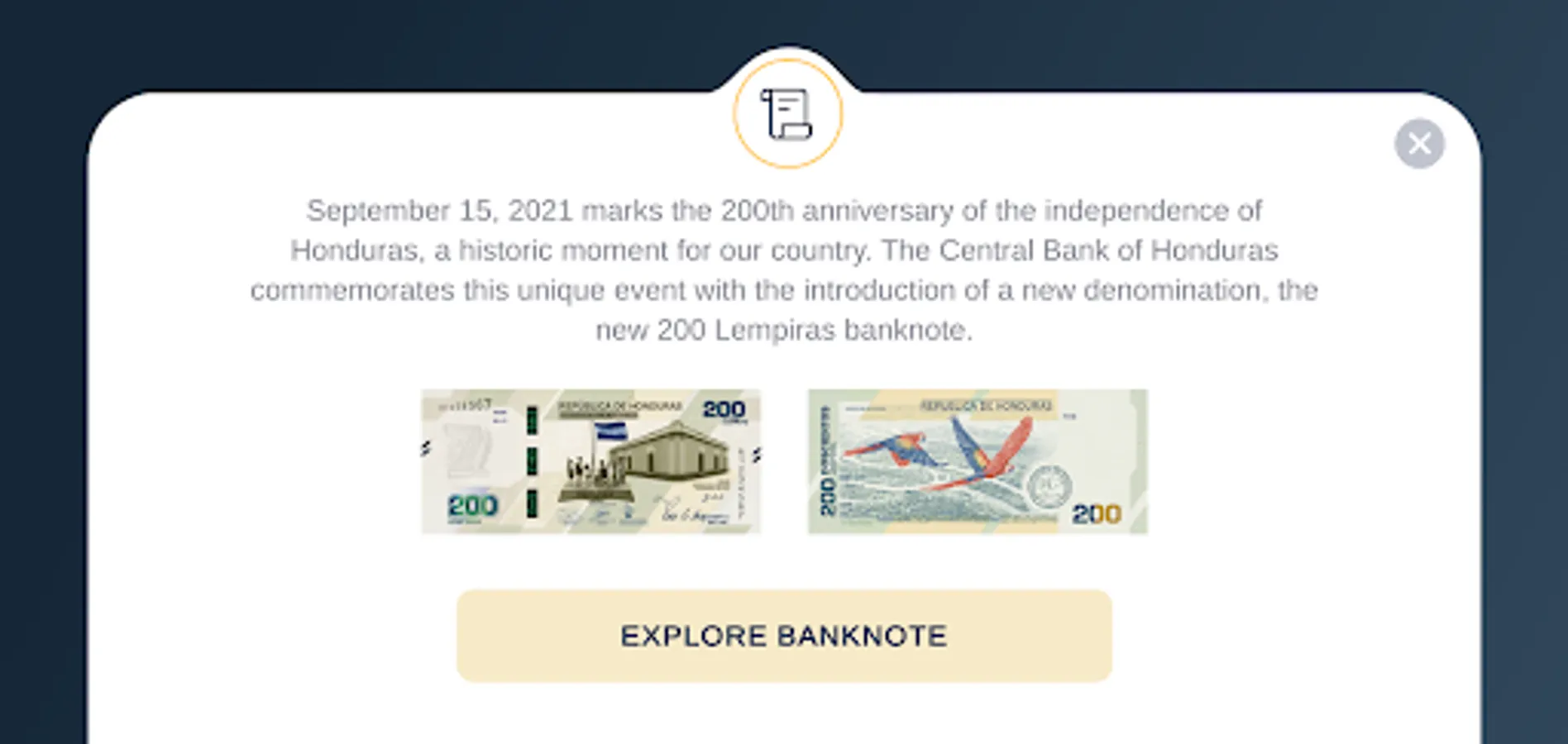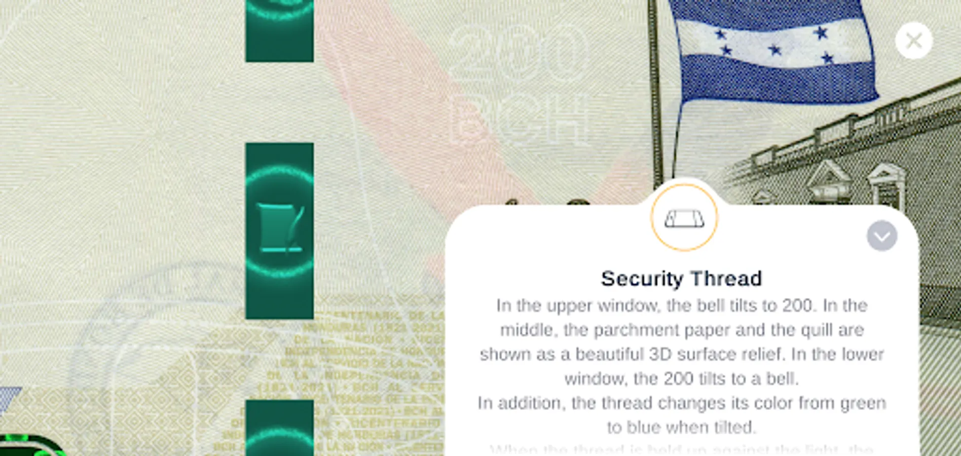 The, "BCH Lempiras” app allows users to discover the security features of the new Lempiras banknote brought into circulation for the celebration of September 15, 2021. It explains interactively how the security feature react when a banknote is tilted, held against the light, or if a magnifier glass is used.