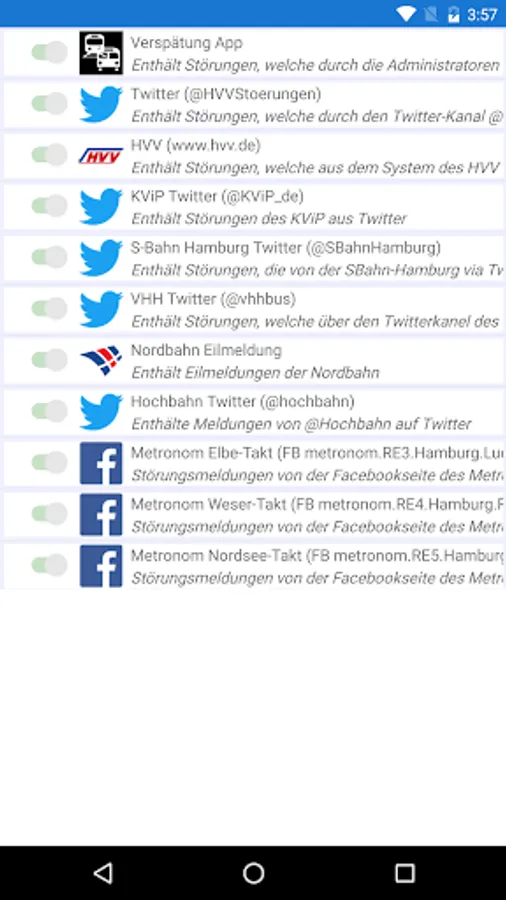 Information will be gathered from social media and real-time information from many companies from different, even unofficial, processed sources. Among other things: HVV, Elevated Railway Hamburg, TBR, S-Bahn Hamburg, AKN, German Railway, Northern Railway, metronome, CCG, Line, Kvip, HADAG and many more.