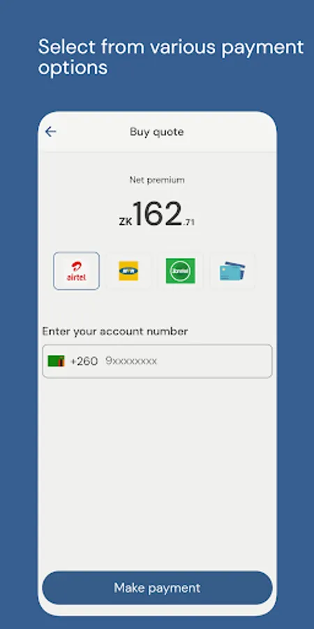 The Insurance Association of Zambia (IAZ) embarked on a project to automate and digitize Motor Insurance on the Zambian Market. The IAZ Motor Insurance App was developed with the sole purpose of achieving this objective. The IAZ Motor Insurance App hosts all motor products from all general insurance companies in Zambia. The insuring public are able to purchase Comprehensive, Third Party Fire and Theft, Third Party and Act Only through the IAZ Motor Insurance App.The insuring public can pay for their premiums using Airtel Money, MTN Mobile Money,Zamtel Kwacha and Visa card payments. Policy documents are generated and delivered to clients via email and other digital means.