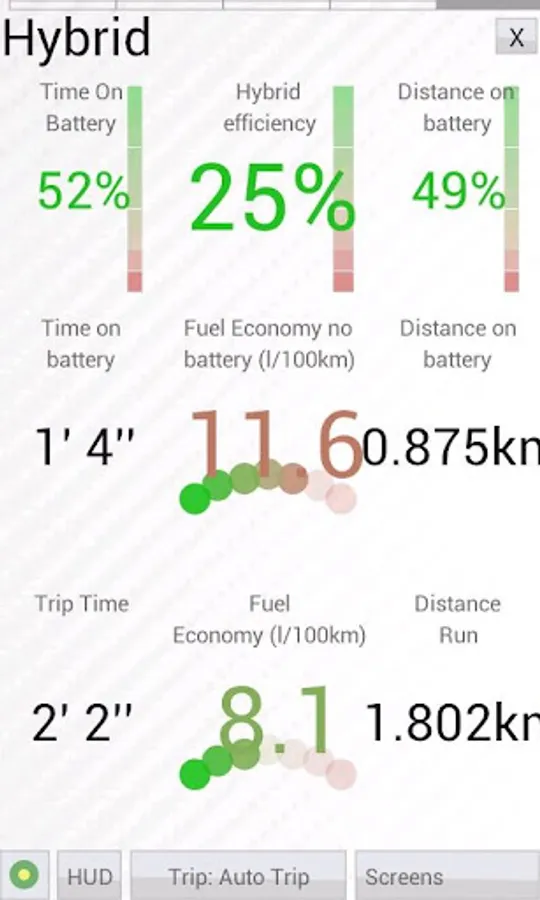 - Total trip MPG, MPG on hot engine, MPG without idling/jams