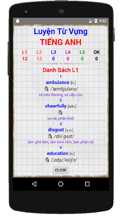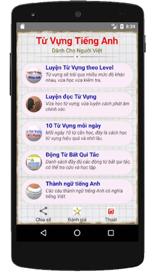 Gom 3 phan chinh: Luyen tu vung, 10 Tu moi ngay, Luyen doc tu vung
