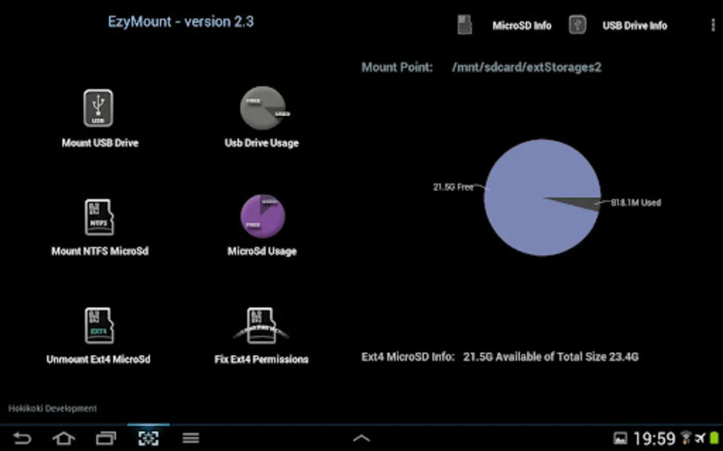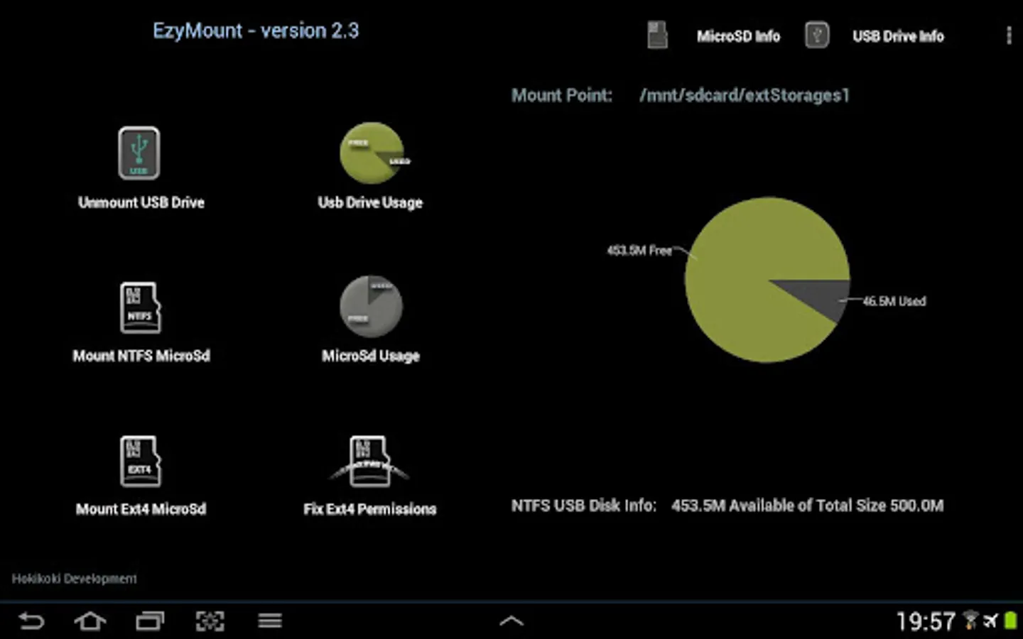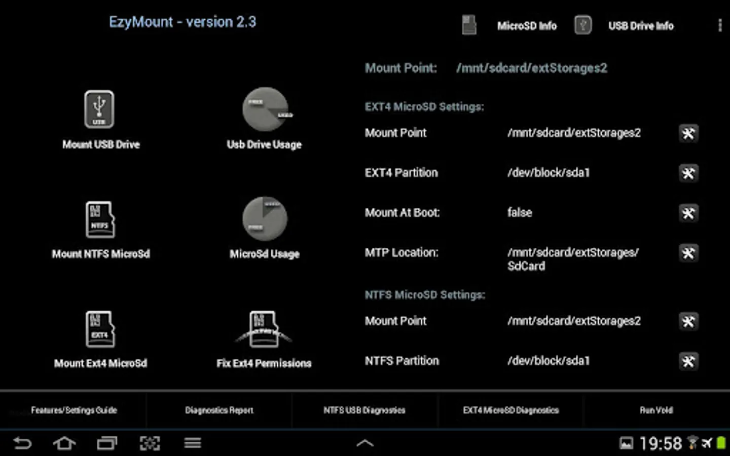 With EzyMount you have NTFS reading & writing. Ext4, Ext3, Ext2 read & write support. Automatic Ext4, Ext3, Ext2 Permission handling by the app. Automatic USB device mounting as well as 1-Click mounting widget. Auto Mounting of any internal Ext4 or NTFS MicroSD partitions at Boot Time. EzyMount provides File usage charts of mounted filesystems so you can keep track of your storage requirements.