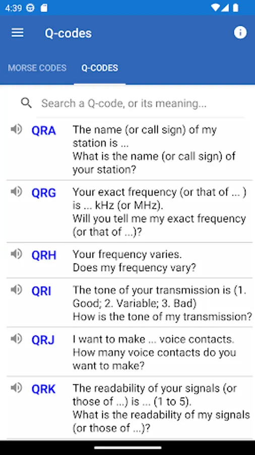• The translator supports also amateur radio Q-codes. When you enter a Morse code and a Q-code is found in it, the meaning of this Q-code is added next to it in the brackets. This function can be turned off in the settings if you do not want to use it.