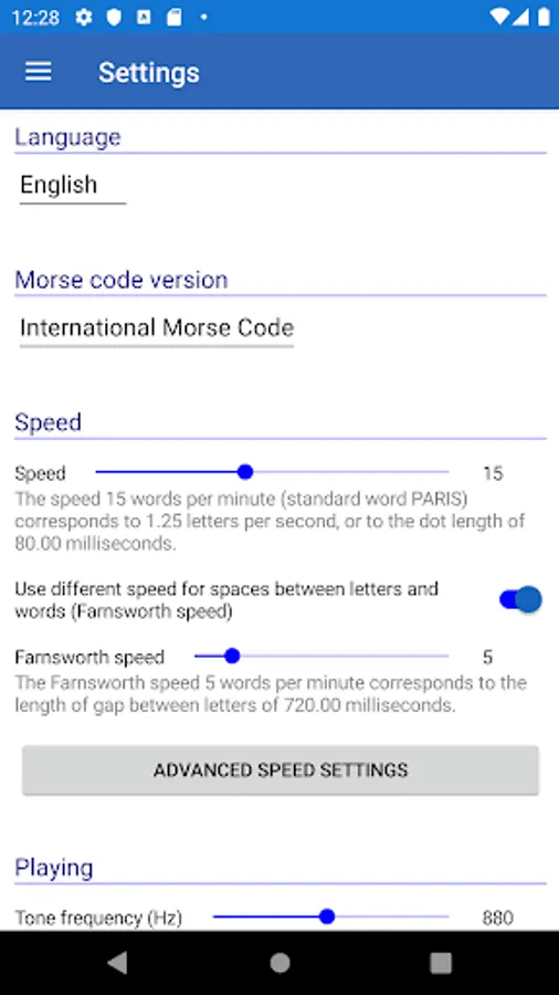 • You can adjust the transmission speed, Farnsworth speed, tone frequency and other settings. You can also choose one of versions of the Morse code. Currently, the International Morse Code and a few local versions of Morse code are supported (e.g., Greek, Japan, Korean, Polish, German, and others).