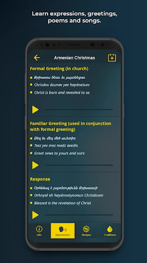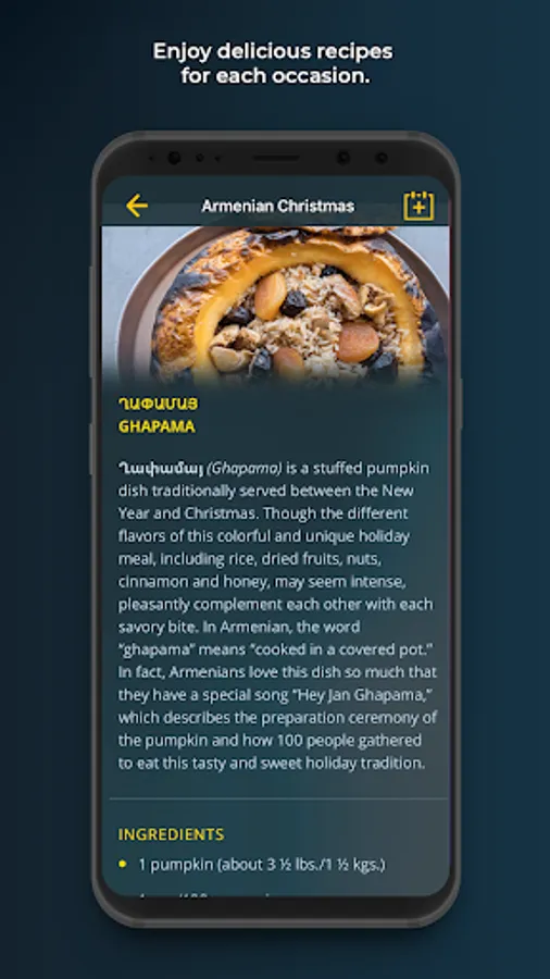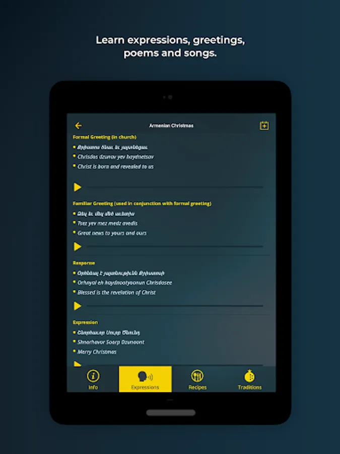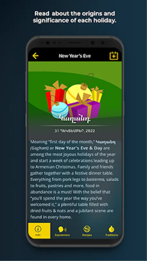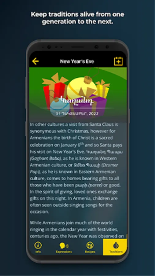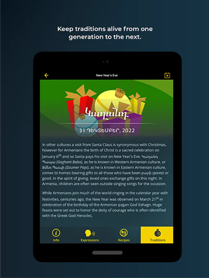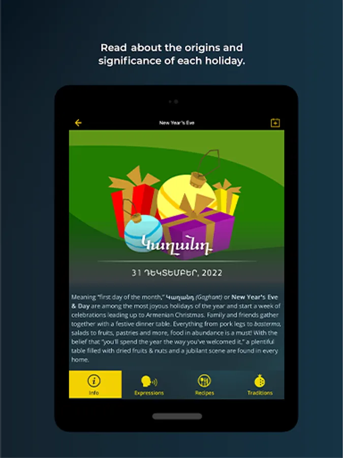 From the old to the new, each entry offers information about the origins and significance of the holiday and provides commonly used expressions, greetings, poems and songs. For a fuller experience, get everyone together and enjoy Armenian cuisine by preparing traditional recipes included for each occasion. This app is a fun and easy way to keep traditions alive from one generation to the next.