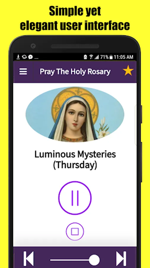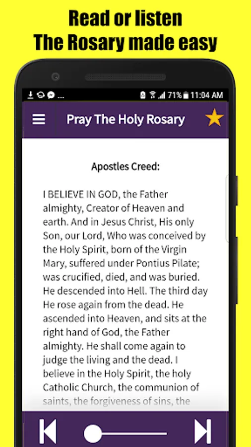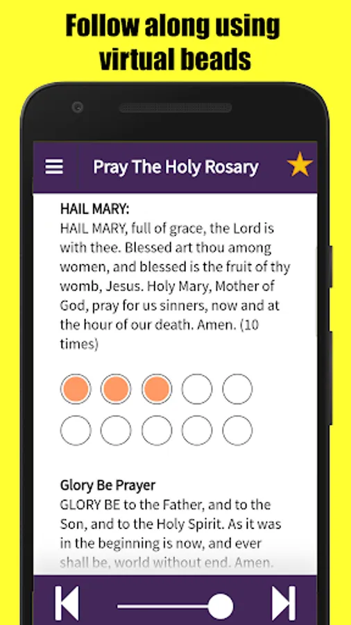 The Holy Rosary with Audio offline is an easy to use and clean Android app designed for simply praying along with the Holy Rosary of the Virtgin Mary. No wi-fi is required, you don't need to be connected to the internet as the audio is not streamed. It is already embedded into the application you are downloading-