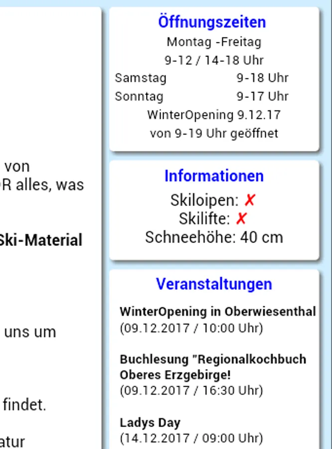 Information on snow depth, operating times of the ski lifts, condition of skiing tracks in Oberwiesenthal. Events in and around Oberwiesenthal. Skiflohmarkt and promotions of the shop.