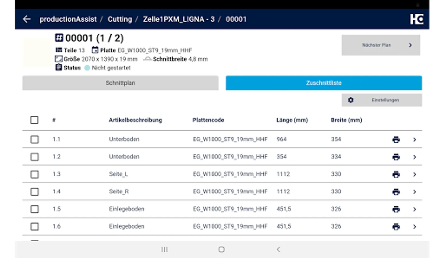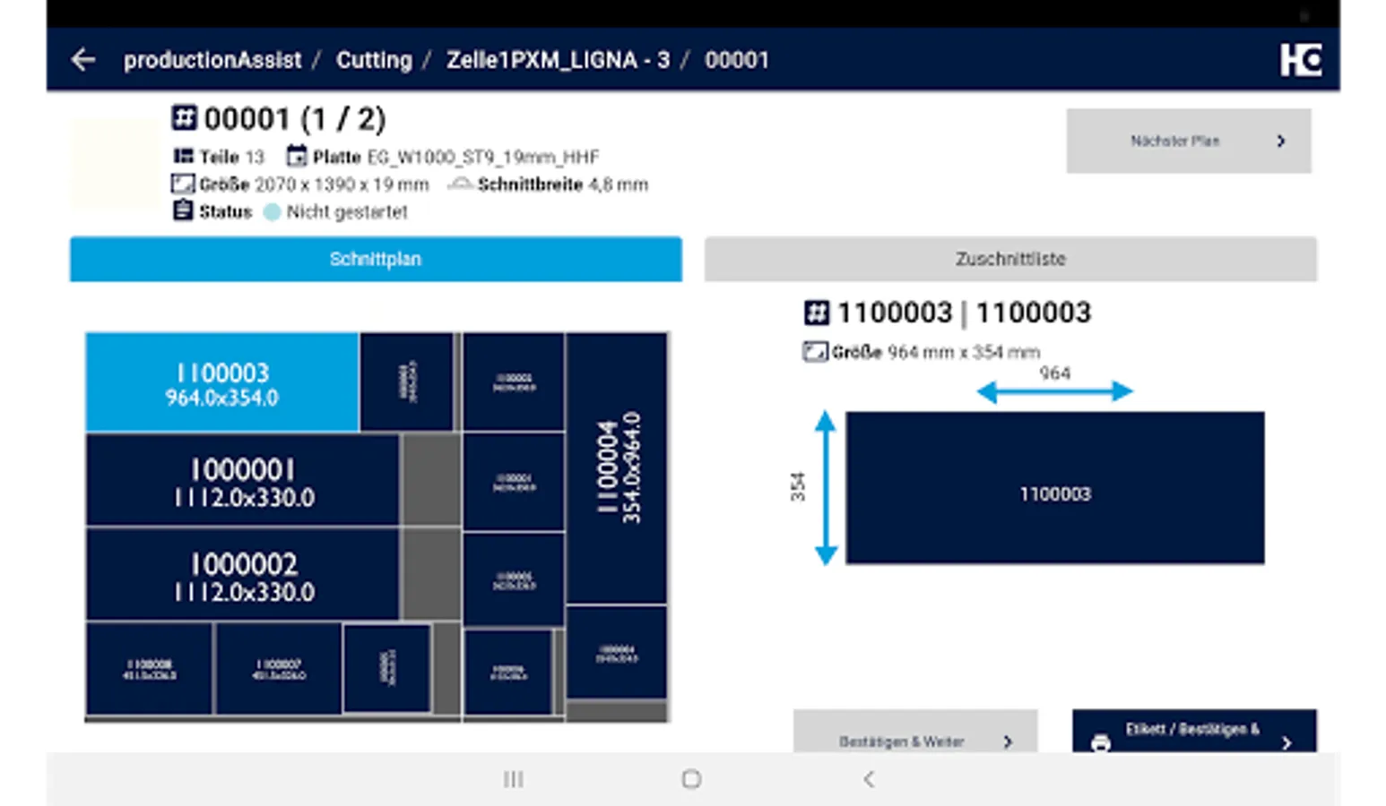 In productionAssist Cutting you can easily select your next cutting pattern. Print labels with a click. As a result, every part is clearly identified — at the same time, the label provides processing information for your edge banding machine and CNC processing center.