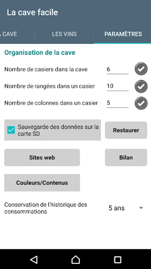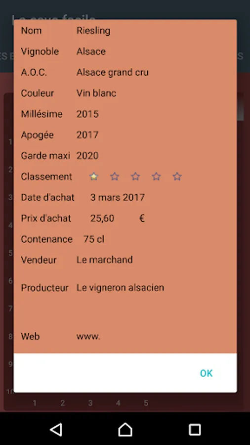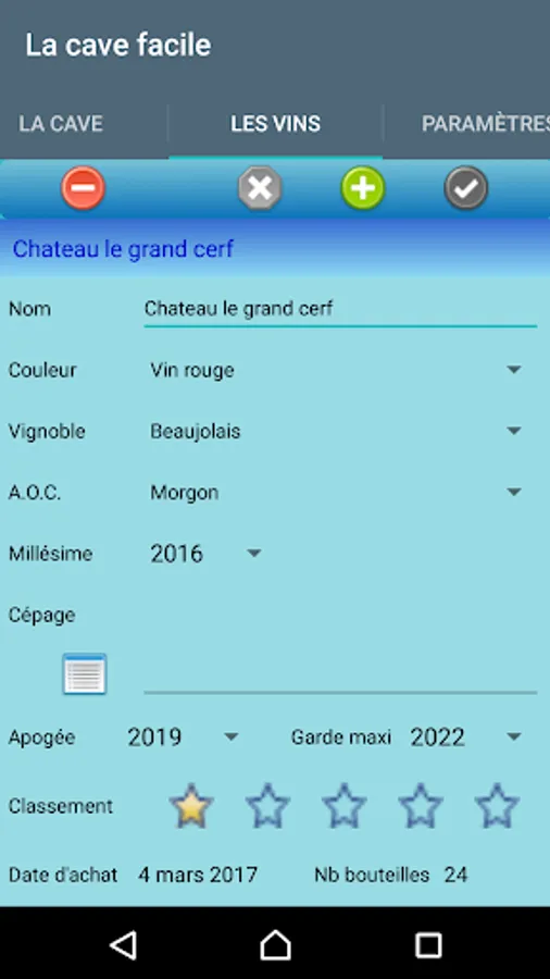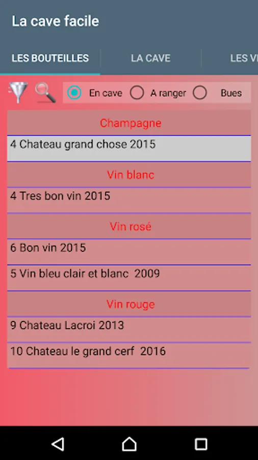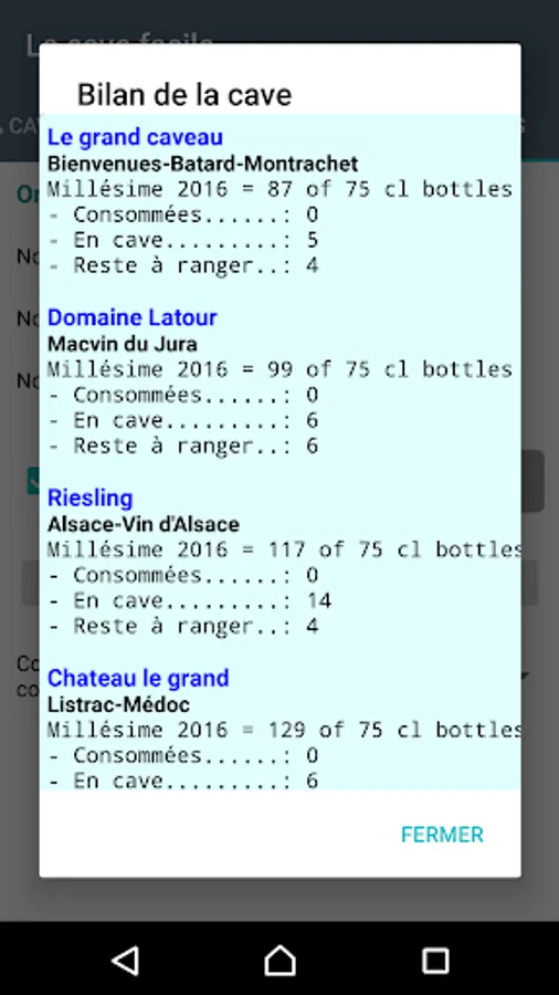 Characteristics of different wines from the cellar. Name, vineyard, AOC / AOP, grape, photo, number of bottles,