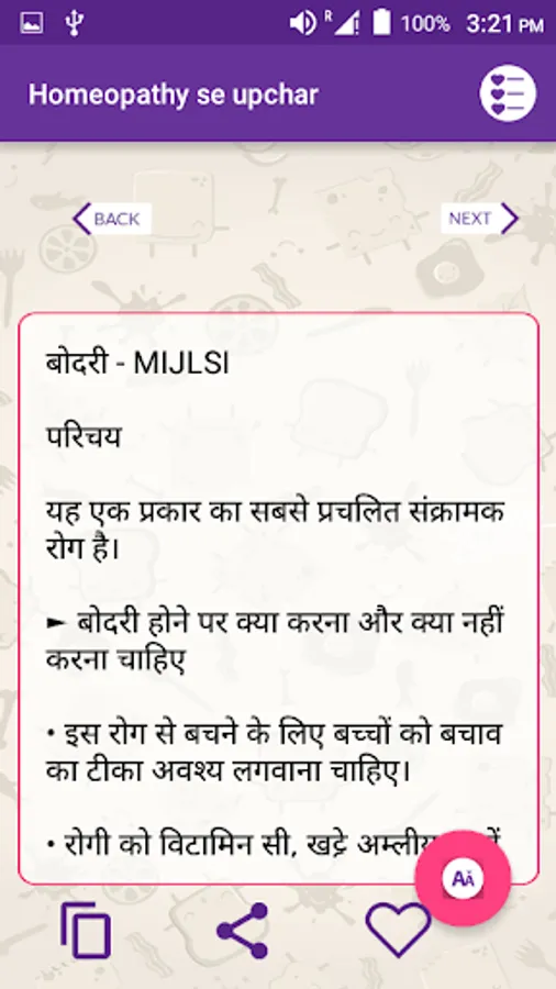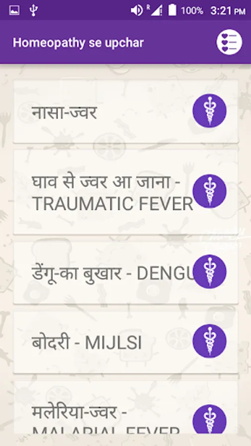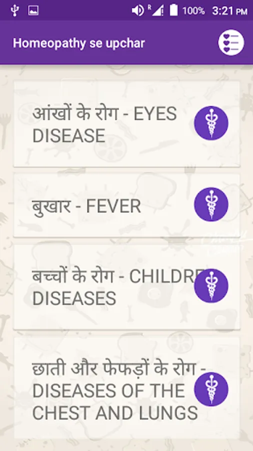 This app, organised for quick and handy reference, provides homoeopathic cures and prevention for nearly all-common diseases as also many chronic ones in hindi.