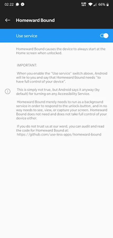 Homeward Bound is an accessibility service that makes your device always start at the Home screen when you unlock it.