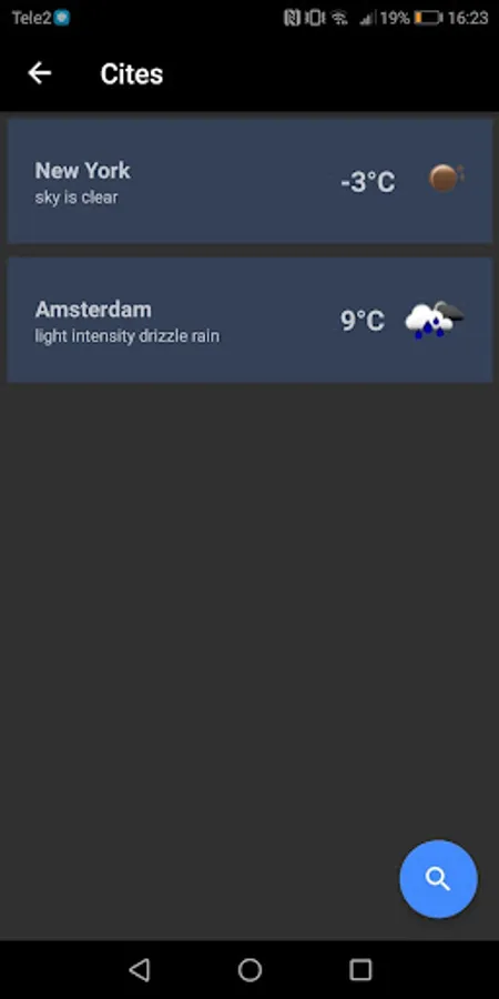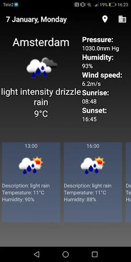 The application allows you to get a detailed report on the current weather, and a brief over the next five days with time intervals of three hours. It can store up to 10 different locations in the database.
