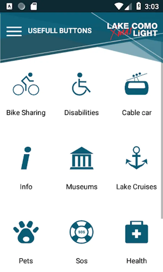 The "Lake Light" app, focused on the points of interest of the Como area and developed on the occasion of the Christmas markets 2018, is divided into 4 main branches accessible only through registration: