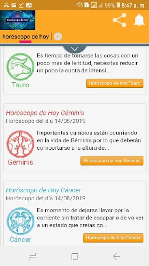 The new version of the My Horoscope of the Day application offers a smoother navigation economy, allowing a better reading of your daily horoscope. Notice that the rubric "my space" offers a more complete presentation of your horoscopes and 100% free total access. Some faults have been corrected. Finally, if you like our application, don't forget to leave us a little comment.