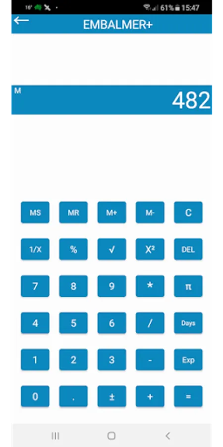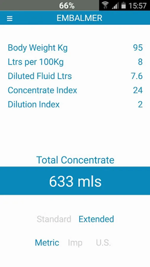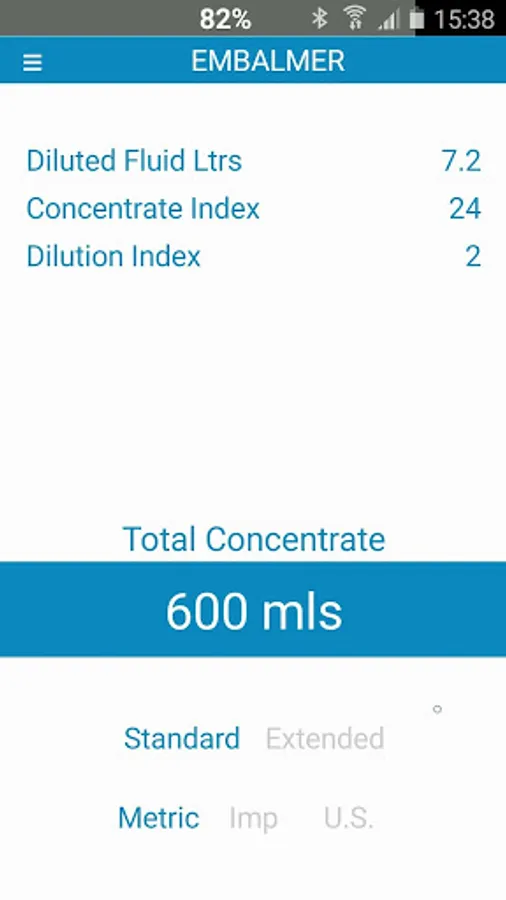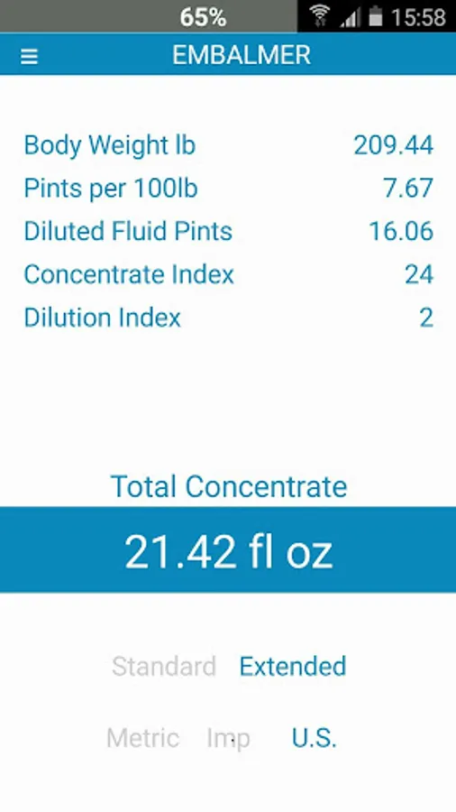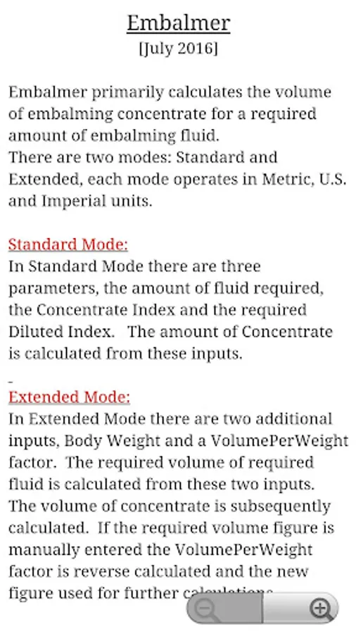 This AD FREE App primarily calculates the volume of embalming concentrate for a required amount of embalming fluid. Embalmer can also calculate any of the other three parameters shown in Standard Mode by dragging that parameter down to the Result Bar.