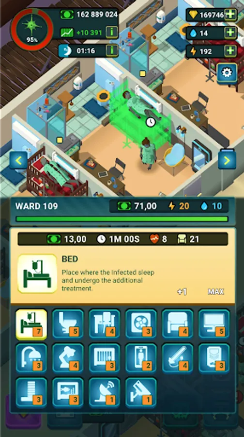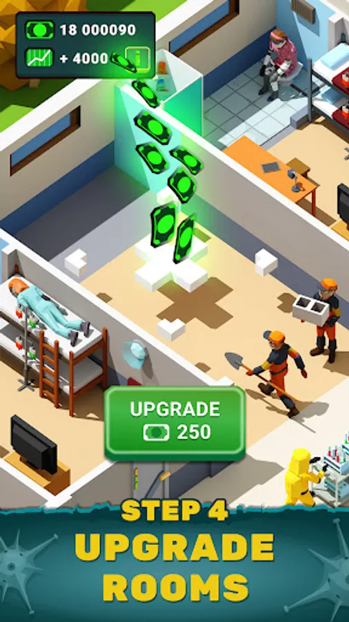 In this idle clicker game, you can manage staff, build and upgrade hospital departments, cure the infected. Supply paramedics with high-quality devices, expand the recreation area and equip the command post. Build your own hospital business empire!