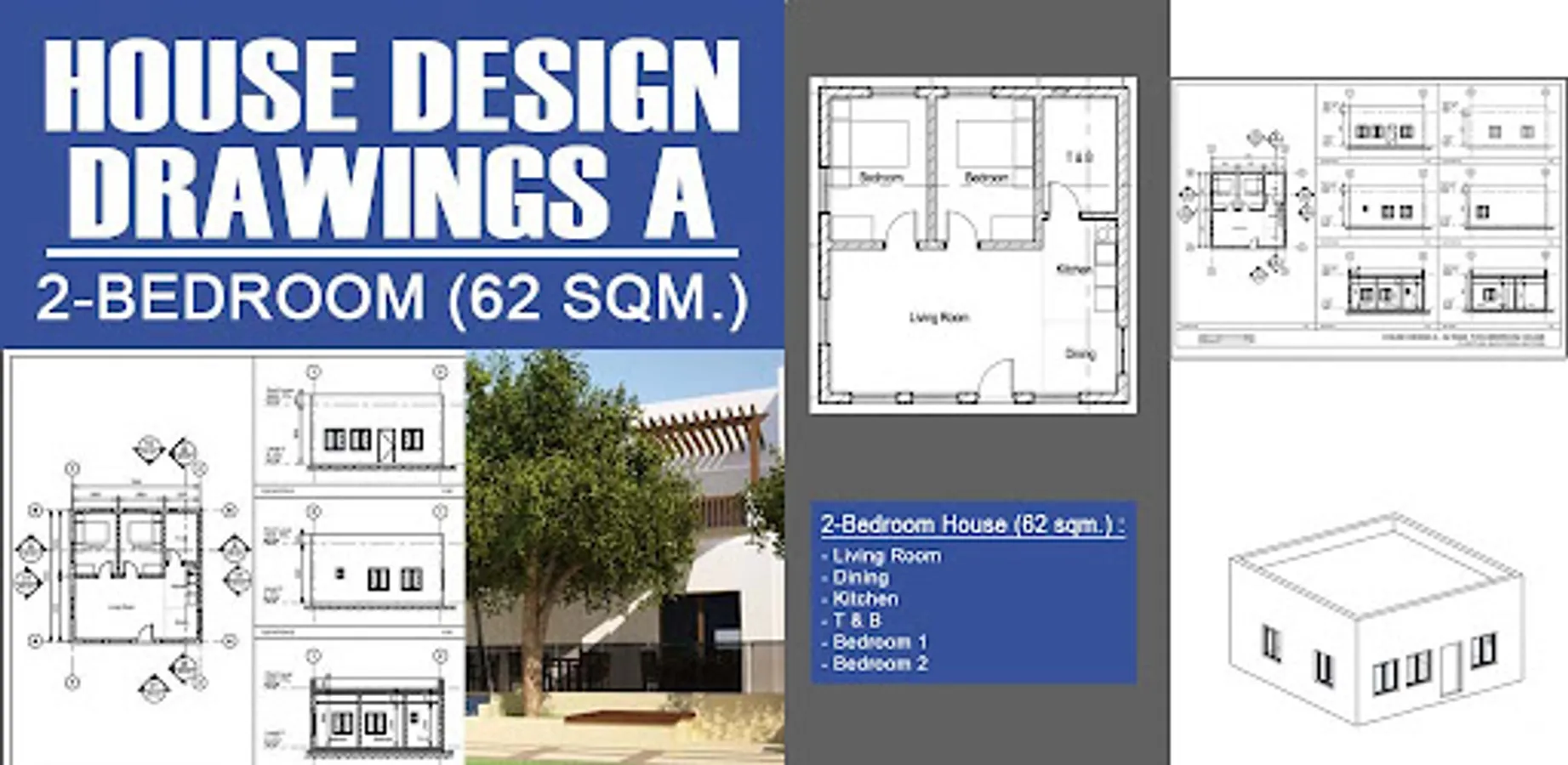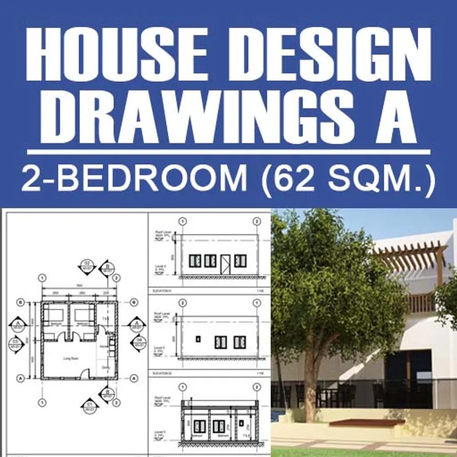 Drawings for a Simple House Design includes floor plans, elevations and sections. 2 Bedroom House dimensions are 8m x 7.8m. Total area is 62 sqm. Save the A3 drawing and show to your local builder.