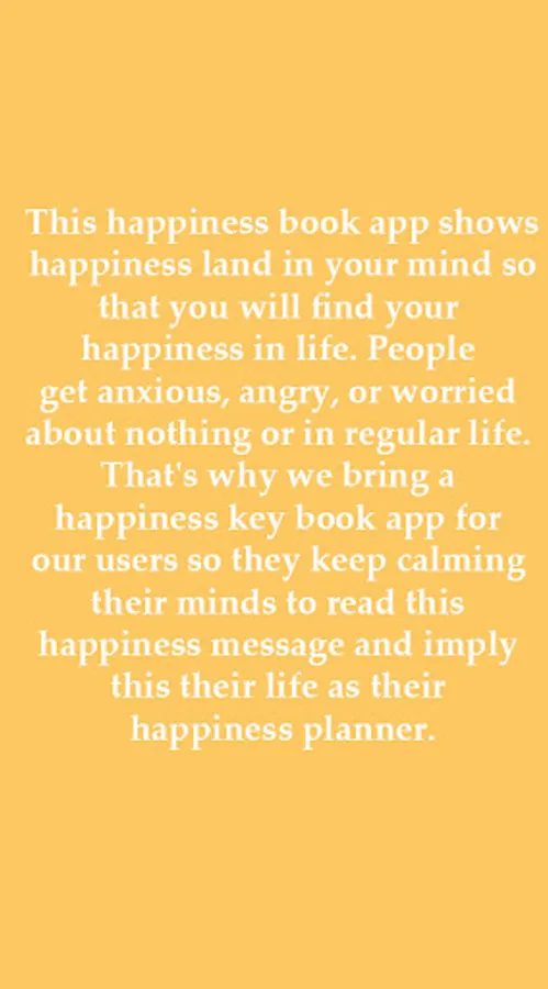 This happiness book app shows happiness land in your mind so that you will find your happiness in life. People get anxious, angry, or worried about nothing or in regular life. That's why we bring a happiness key book app for our users so they keep calming their minds to read this happiness message and imply this their life as their happiness planner.