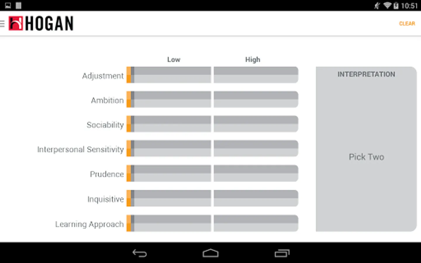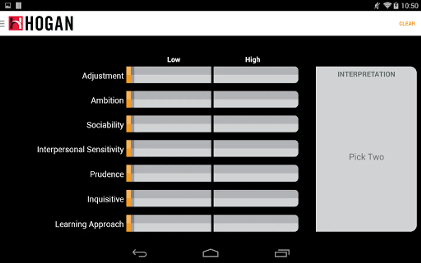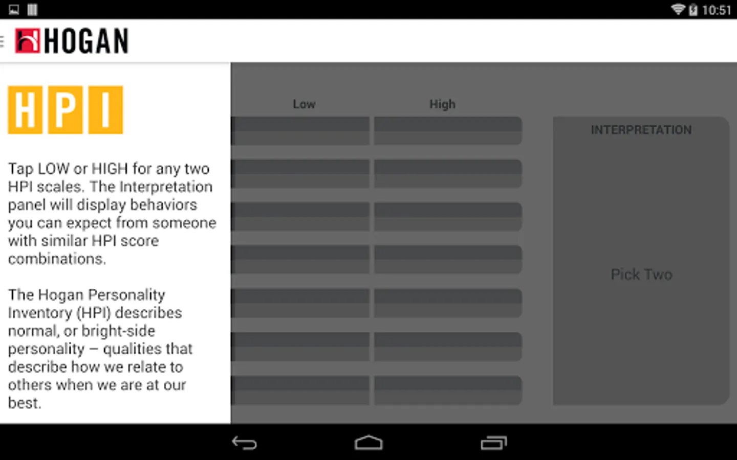 Hogan Pick 2 HPI allows you to easily interpret the high or low score implications of any two HPI scores by tapping LOW or HIGH for any two HPI scales. The INTERPRETATION panel will display behaviors you can expect from someone with similar HPI score combinations.