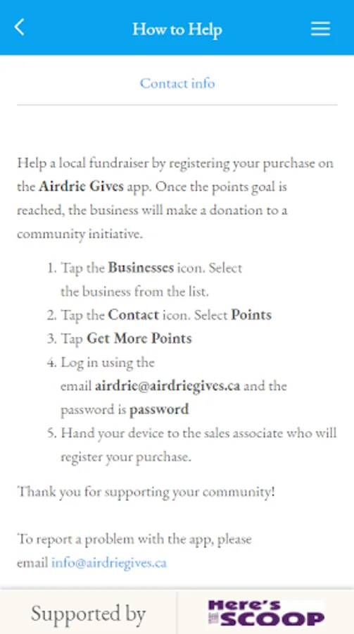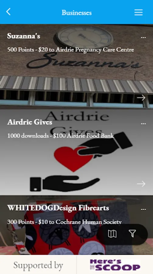 CREATING BUSINESS LOYALTY You as a business determine which local initiatives you wish to support. Through the use of the Airdrie Gives loyalty app, your customers will make purchases that accumulate points towards the fundraiser goal. You determine the point value of the dollar spent in your establishment, set a points goal, the dates of the points campaign and the amount you will be donating to the fund. Once the points goal is reached, your donation, which may be tax-deductible, will be supporting a worthwhile cause in your community.