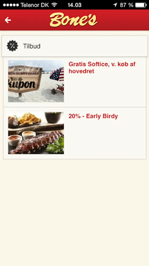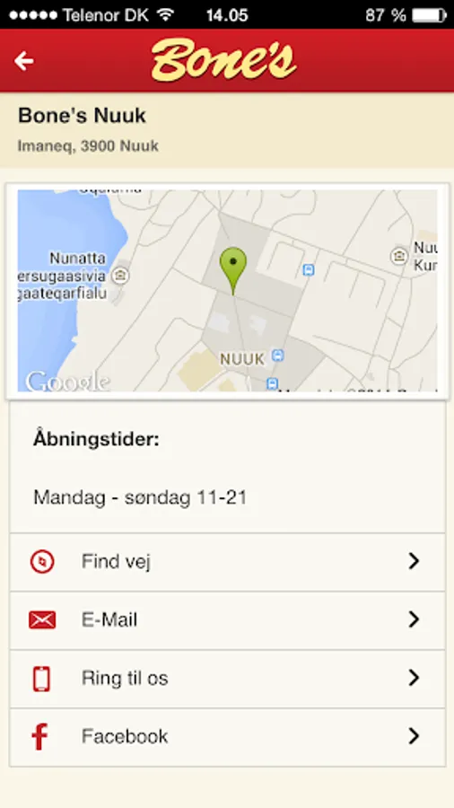 Bones Nuuk app provides you with useful information about our restaurant. Here you can get information about location, opening hours and contact information. You also have the opportunity to see our menu, specials and promotions plus that can be ordered table and Takeaway with the app. With our push messages, you can continually get current offers.
