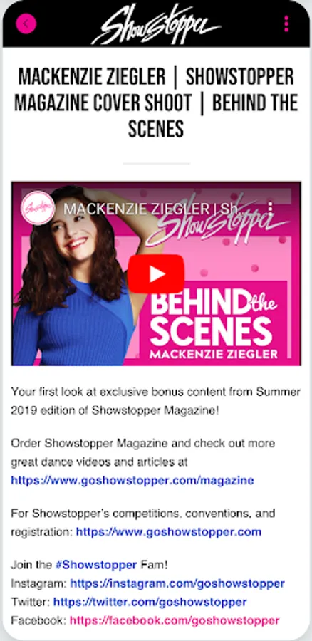 The Showstopper App has it all for dancers and non-dancers alike - Trending stories in dance and teen lifestyle that you should be reading right now. Exclusive interviews and videos of your favorite celebs that you cannot see anywhere else. And for all our competition and convention goers, a full set of resources to make your Showstopper experience that much better.