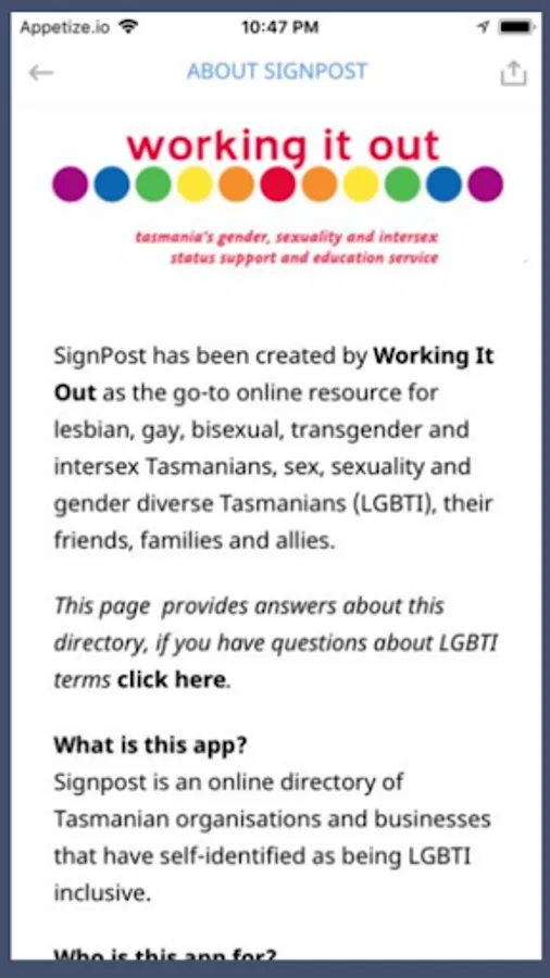 It means we’re the go-to online resource for lesbian, gay, bisexual, transgender and intersex Tasmanians, sex, sexuality and gender diverse people (LGBTI), their friends, families and allies. Signpost was developed by Working It Out – Tasmania’s gender, sexuality, and intersex status support and education service.